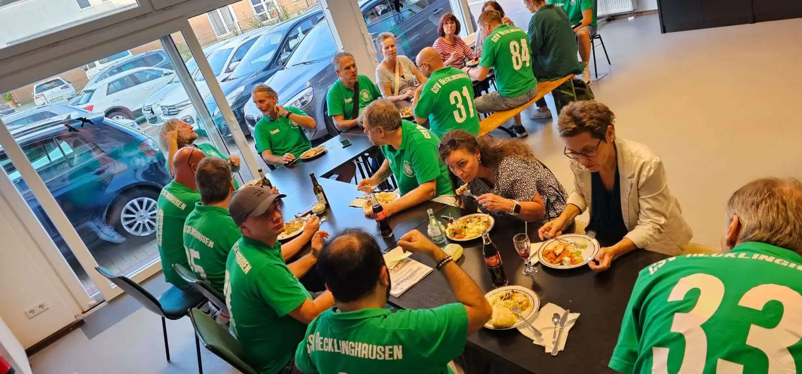 Am Samstag, 26.08.2024 fand die Jubiläumsfeier des Seniorenfußballs im Gehörlosenzentrum in Recklinghausen statt. Einlass begann 16.30 Uhr und 28 männliche Mitglieder feierten gemeinsam. 6 Frauen kamen auch mit! Abteilungsleiter Christian Stern und 2. Leiter Frank Hellwig trugen die Geschichte der Abteilung von 2019 bis jetzt mit Beamer vor. 8 treue Mitglieder waren von der Gründungsabteilung des Seniorenfußballs dabei! Ab 18 Uhr wurde das Buffet eröffnet .Es war eine tolle Stimmung.