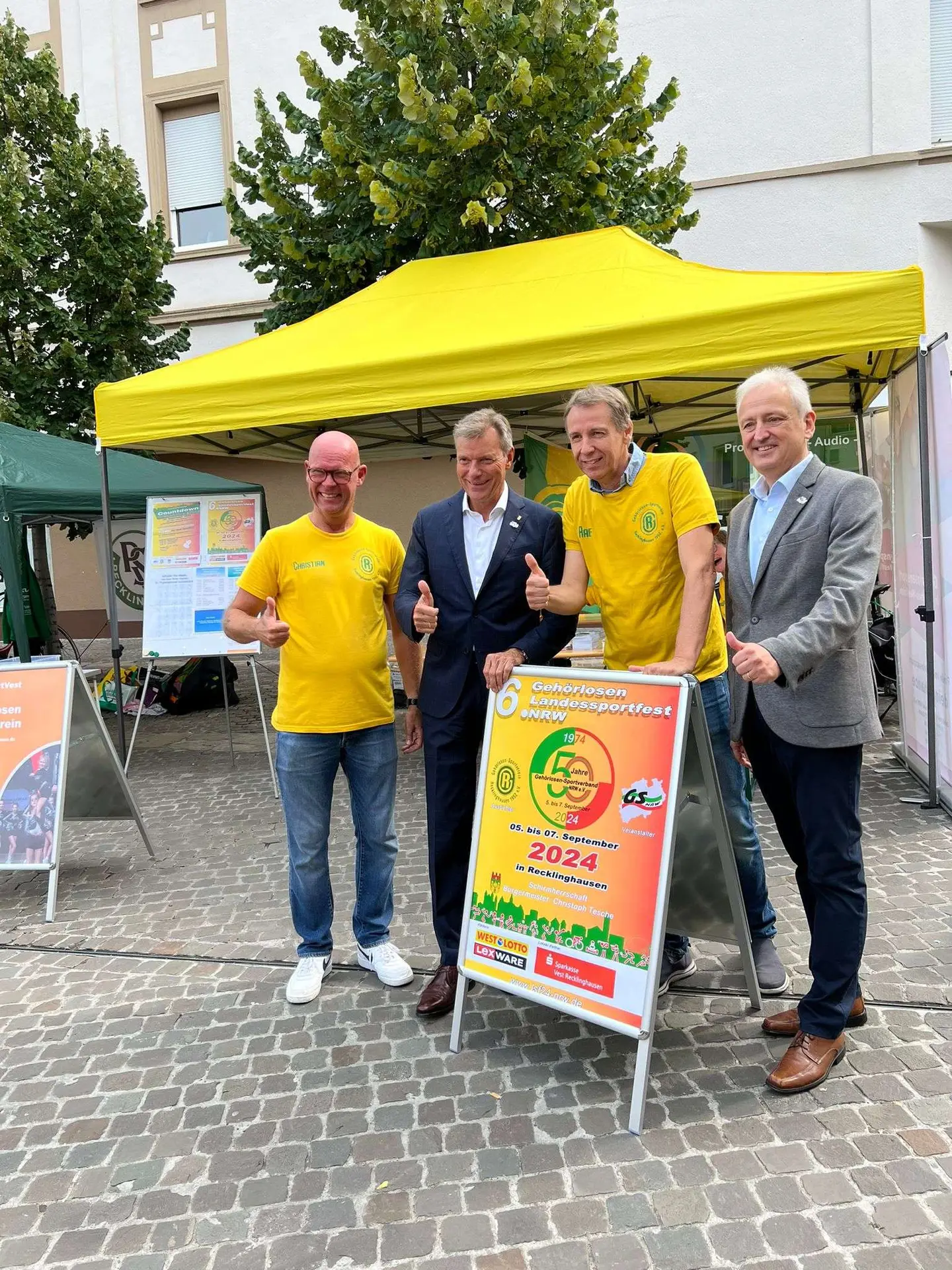 Für das 6. Landessportfes werden rund 600 Teilnehmer*innen erwartet. Schirmherr vom Landessportfest ist Recklinghausens Bürgermeister Christoph Tesche. Und der rührte bereits beim StadtSportVest am vergangenen Wochenende kräftig die Werbetrommel für das Gehörlosen Landessportfest NRW, das vom 5. bis 7. September 2024 an verschiedenen Standorten durchgeführt wird.