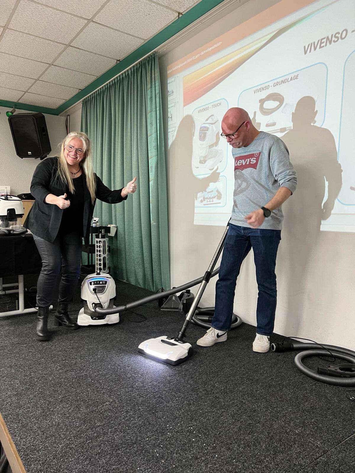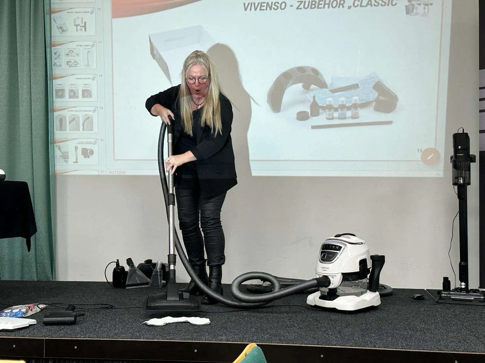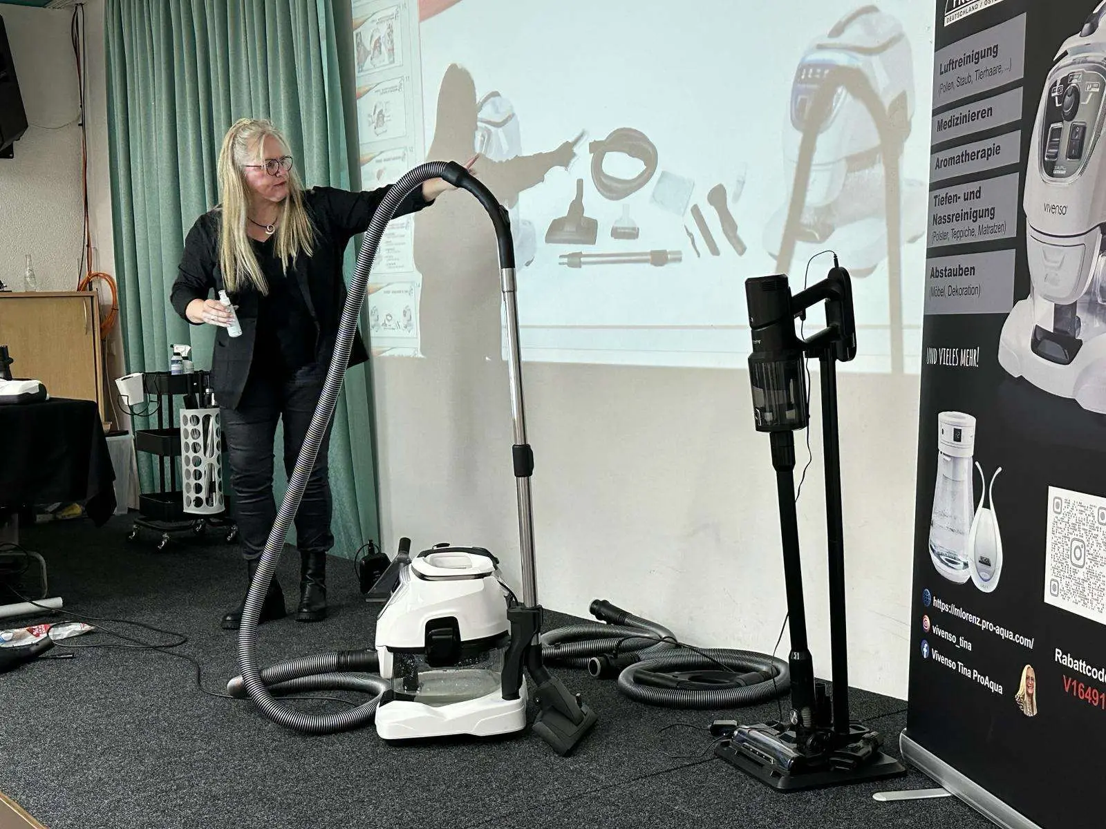 Frau Lorenz erklärte, wie Wasserstaubsauger Schmutz und Staub mithilfe von Wasser filtern. Sie hob hervor, dass diese Geräte im Vergleich zu herkömmlichen Staubsaugern mehrere Vorteile bieten, darunter: