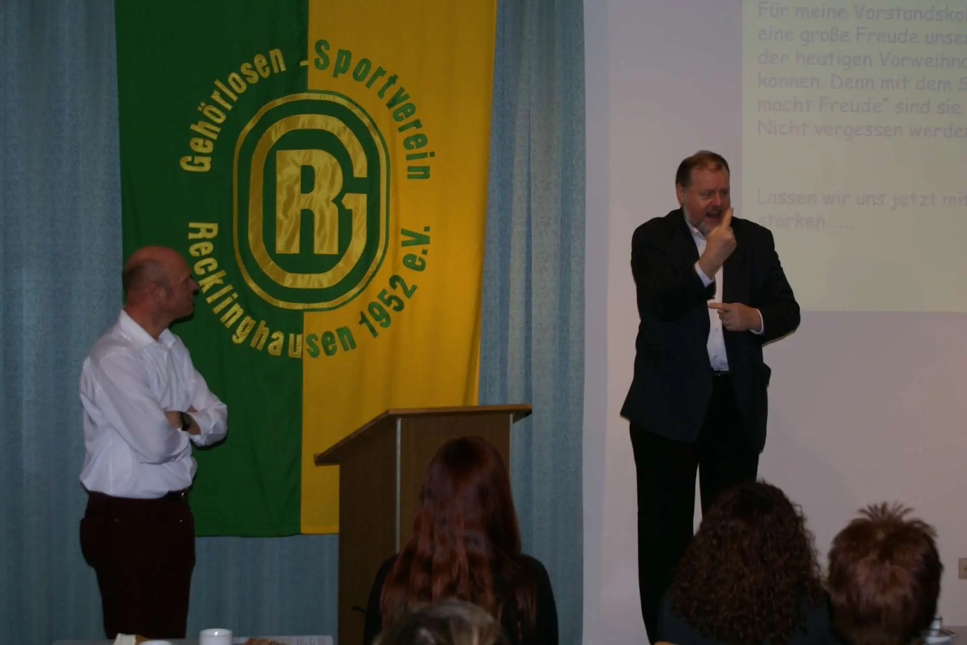 Im Dezember 2023 fand ein Vorweihnachtsfeier im Gehörlosenzesmtrum in Recklinghausen statt. Ganz besonders freue ich mich, dass wir heute einige Ehrengäste begrüßen können,die stets großes Interesse für unsere Vereinsarbeit gezeigt und die uns auch tatkräftig unterstützt haben. Trotz seiner vielen Verpflichtungen hat unser Landrat, Herr Cay Süberkrüb, den Weg zu uns gefunden und eine Geldspende von 50,- Euro mitgebracht. Vielen Dank! Der Bürgermeister der Stadt Recklinghausen, Herr Wolfang Pantförder kommt leider nicht, aber der stellvertretende Bürgermeister der Stadt Recklinghausen, Herr Ferdinand Zerbst ist gekommen, und gibt uns, wie alle Jahre, die Ehre seines Besuches. Auch der Generalsekretär des Deutschen Gehörlosen Sportverbands und Präsident des Gehörlosensportverbands NRW, Herr Winfried Wiencek kann leider nicht kommen. Er lässt euch alle grüßen.